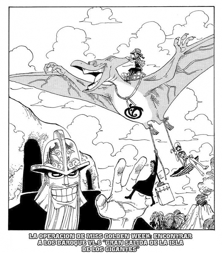 Tras la derrota de los Sombrero de Paja en Arabasta, la Marina arresta a casi todos los miembros de Baroque Works, quedando únicamente Mr. 2 Bon Clay libre. Al enterarse de la situación a través de un periódico en Little Garden, Miss Goldenweek idea un arriesgado plan para rescatar a sus camaradas antes de que sean confinados en Impel Down. Con la ayuda de Mr. 5 y Miss Valentine, decide poner en marcha su singular estrategia: utilizar la técnica tomodachi no kimidori para convocar a un dinosaurio que los transporte volando hacia su punto de encuentro.