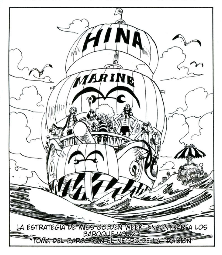 Sin embargo, el plan sufre un revés inesperado cuando una lluvia repentina borra la pintura identificadora del dinosaurio, lo que provoca que el animal entre en un frenesí y arroje a los miembros de Baroque Works a una isla vacacional. Allí, se encuentran con la capitana Hina, Jango, Fullbody y numerosos marines disfrutando de sus vacaciones. A pesar de intentar pasar desapercibidos mediante disfraces, Hina logra reconocer sus rostros en unas tarjetas que Mr. 13 y Miss Friday se vieron obligados a elaborar, lo que la impulsa a lanzar un ataque contra ellos.